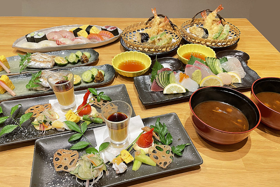 当店では、四季折々の旬の素材を活かした創作料理もご用意しております。鮨のみならず、さまざまな創作料理と全国各地のお酒とのペアリングもお楽しみいただけます。